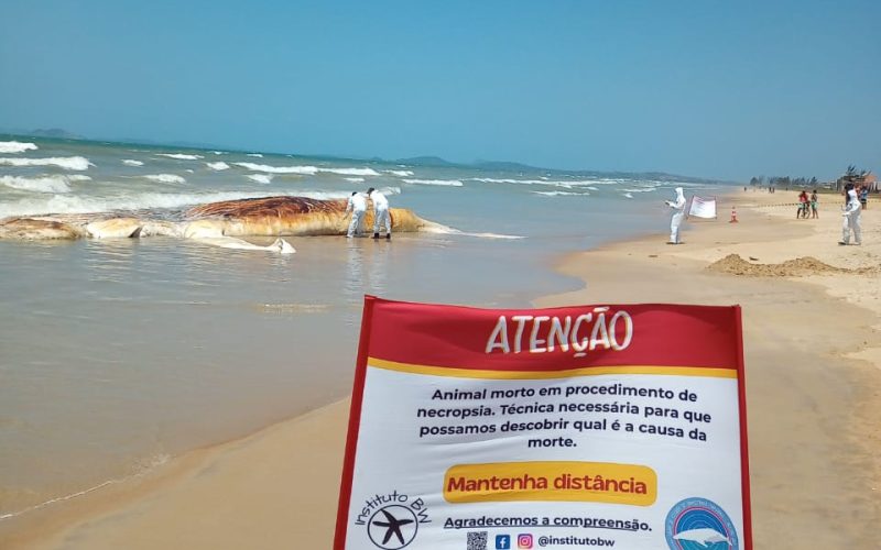 Uma baleia-jubarte foi encontrada morta na manhã desta segunda-feira (30) na Praia de Unamar, distrito de Tamoios, em Cabo Frio. O Instituto BW e o Grupo de Estudos de Mamíferos Marinhos da Região dos Lagos (GEMM-Lagos) foram acionados pela Guarda Marítima e Ambiental para examinar o animal. Especialistas realizaram uma necropsia no local, que pode fornecer pistas sobre o que levou à morte da baleia, mesmo em seu avançado estado de decomposição.