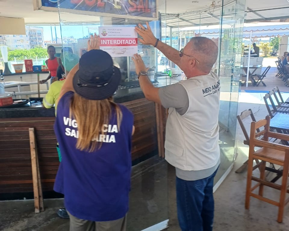 A Vigilância Sanitária de Cabo Frio interditou dois quiosques na Praia do Forte nesta quarta-feira (5) após encontrar diversas irregularidades sanitárias. Durante a fiscalização, realizada com o apoio da Secretaria de Meio Ambiente, Saneamento e Clima, foram encontradas baratas mortas e vivas, acúmulo de sujeira, fiação exposta e alimentos sem validade identificada ou armazenados de forma inadequada.