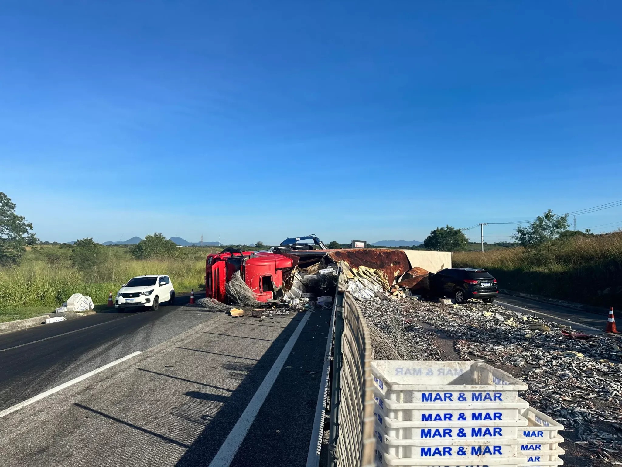A carga de peixe ainda está espalhada na pista, o que tem causado lentidão no tráfego da região. O fluxo de veículos está sendo desviado para o acostamento nos dois sentidos da RJ-124, enquanto a remoção da carga e do caminhão não é concluída. A concessionária estima que o trabalho dure mais algumas horas.