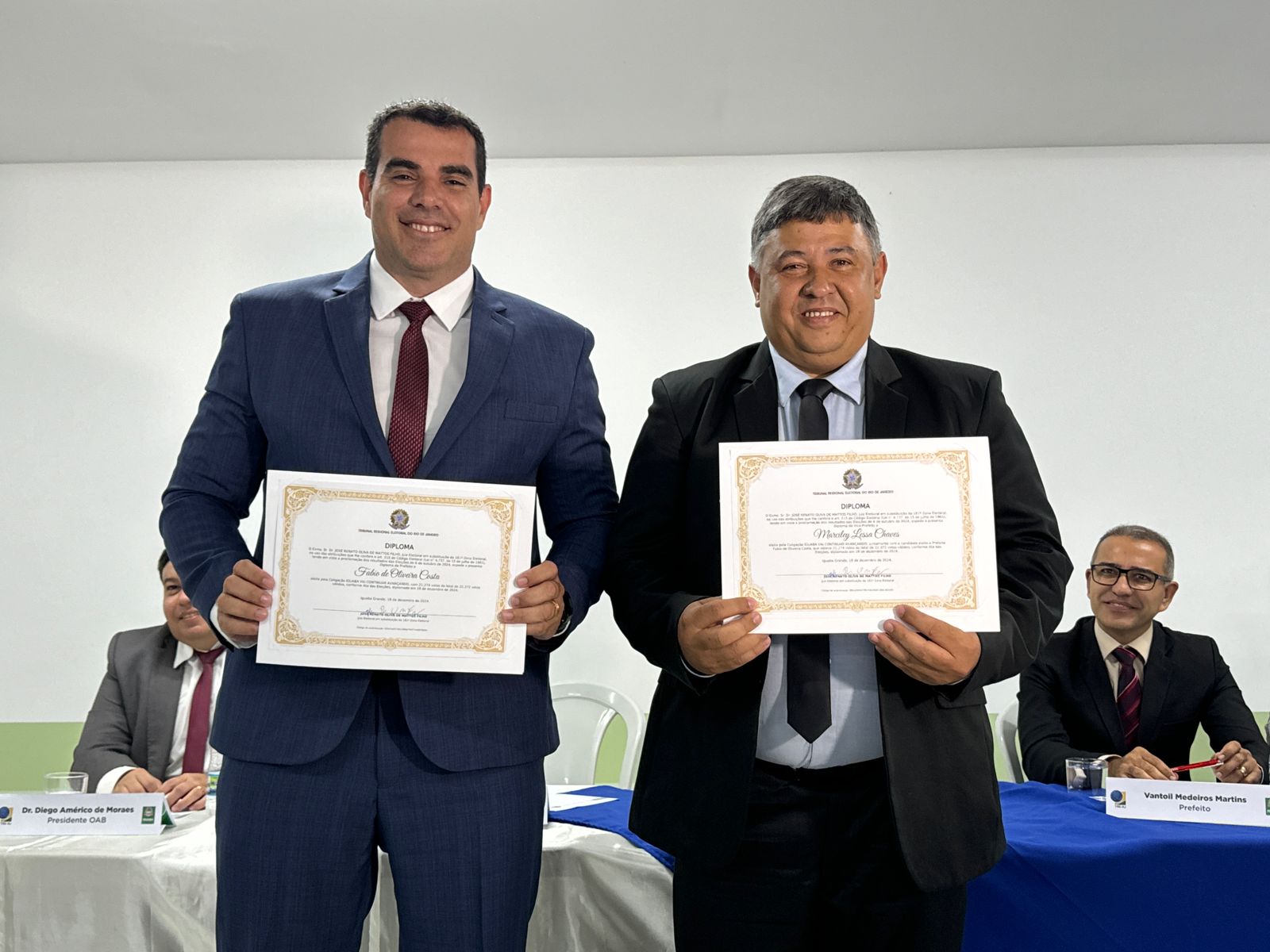 Em cerimônia realizada nesta quinta-feira (19), no Auditório da Escola Municipal Prefeito Oscar Magalhães, Fabinho e Marciley Lessa, foram diplomados em Iguaba Grande para o mandato de prefeito e vice-prefeito, que se inicia em 1º de janeiro de 2025. Eleito com expressivos 95,09% dos votos, Fabinho registrou um dos maiores índices de aprovação da Região dos Lagos, reflexo da gestão anterior marcada por avanços na saúde e na educação.