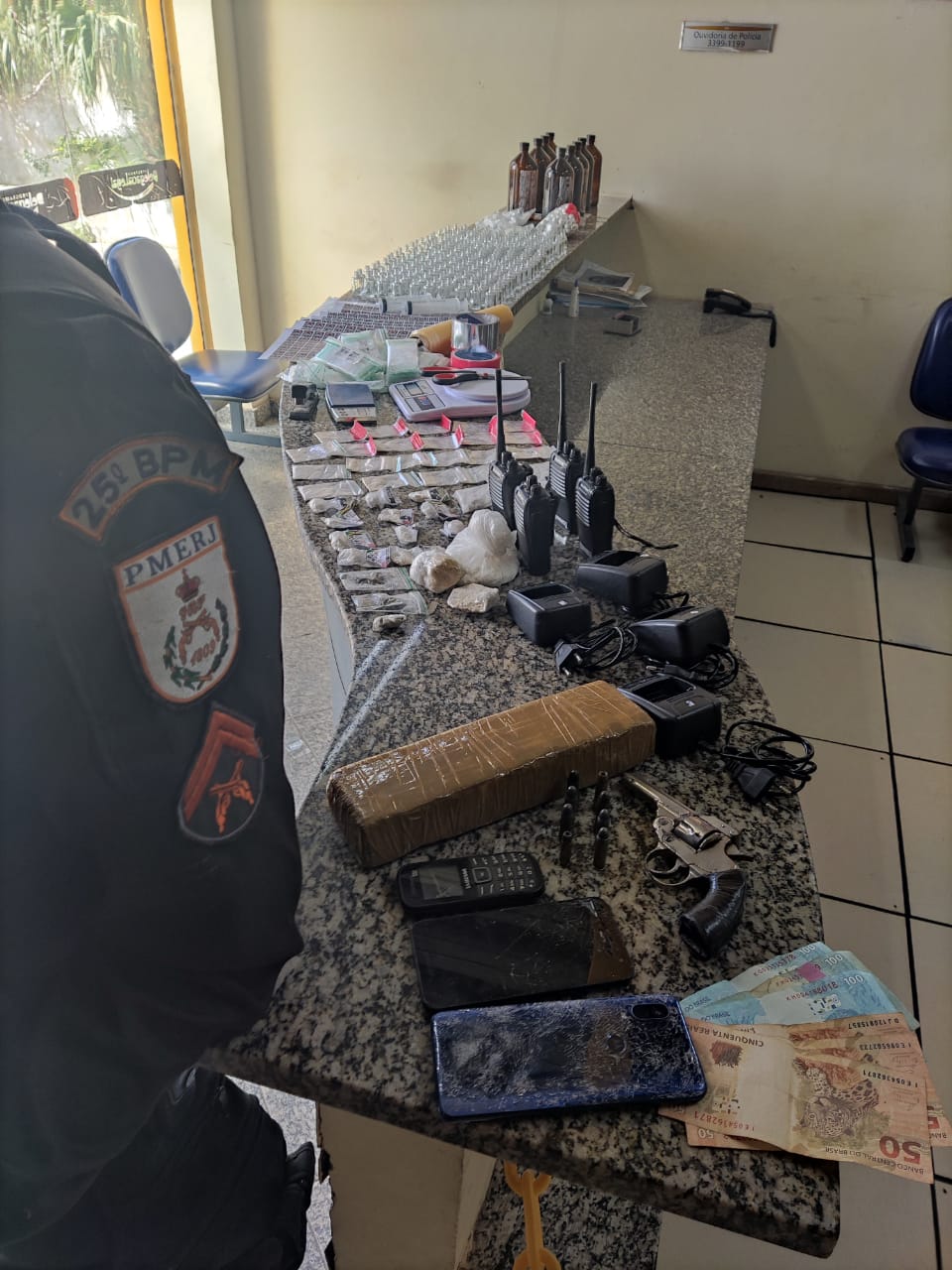 Segundo a polícia, ao ser abordado ele informou o local onde estavam as drogas. Foram apreendidas 120 pedras de crack, 152 pinos de cocaína e 235 tabletes de maconha, dois rádios transmissores e 20 reais em espécie.