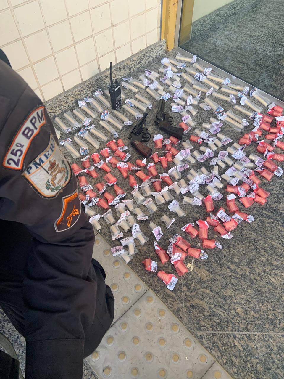 Ainda de acordo com a polícia nas mochilas e nas sacolas que estavam com os suspeitos foram encontrados 195 pinos de cocaína, um rádio transmissor e quatro estojos de calibre 28, além dos dois revólveres.