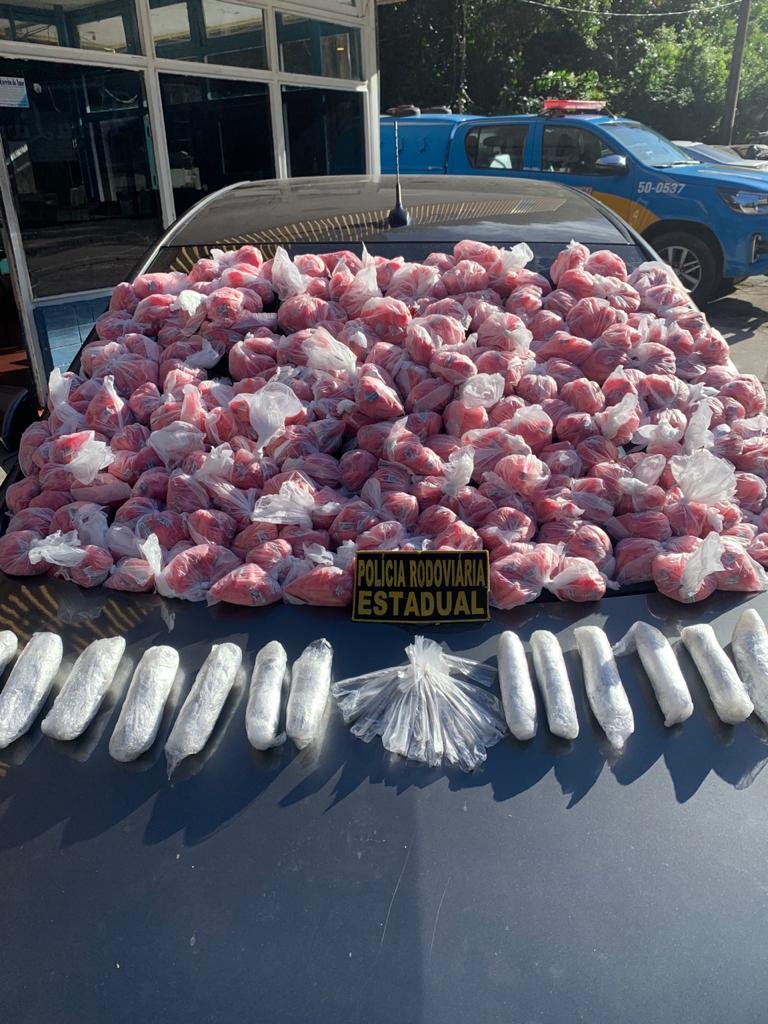 Em busca feita no automóvel, foi encontrada grande quantidade de material entorpecente como maconha e cocaína.