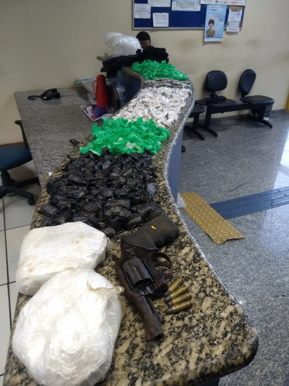 Dentro do tonel foram encontrados 666 pinos de cocaína; 1,5 kg de pasta base da mesma droga; 46 tabletes de maconha; um revólver calibre 38 com quatro munições e uma capa de colete.