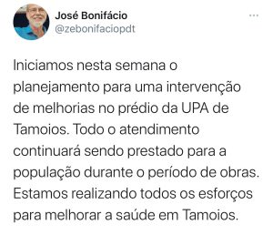 “Iniciamos nesta semana o planejamento para uma intervenção de melhorias no prédio da Unidade de Pronto Atendimento (UPA) de Tamoios. Todo o atendimento continuará sendo prestado para a população durante o período de obras. Estamos realizando todos os esforços para melhorar a saúde em Tamoios. A necessidade de melhorias na estrutura do prédio foi constatada durante uma vistoria técnica realizada pela Secretaria de Obras. O laudo apontou as adequações que precisam ser feitas para garantir a segurança da população e dos profissionais de saúde, além da preservação do patrimônio público”, disse o prefeito em uma rede social.