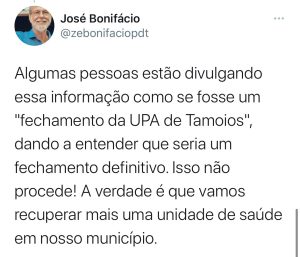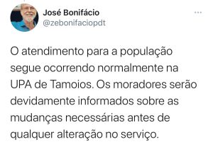 “O atendimento para a população segue ocorrendo normalmente na UPA de Tamoios. Os moradores serão devidamente informados sobre as mudanças necessárias antes de qualquer alteração no serviço. Algumas pessoas estão divulgando essa informação como se fosse um ‘fechamento da UPA de Tamoios’, dando a entender que seria um fechamento definitivo. Isso não procede! A verdade é que estamos recuperando mais uma unidade de saúde em nosso município”, declarou o prefeito.
