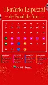 E nos feriados de Natal (25) e Dia da Confraternização Universal (01), as lojas e os quiosques estarão fechados. A praça de alimentação, os restaurantes e os espaços de lazer funcionarão em horário facultativo, das 12h às 22h. O supermercado abre do meio-dia até às 18h.