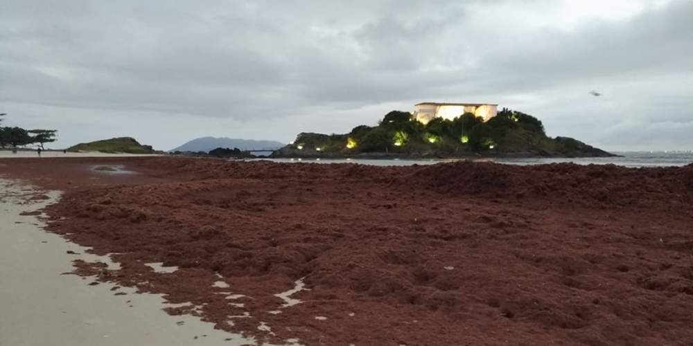 As areias da Praia do Forte, em Cabo Frio, amanheceram com uma grande quantidade de algas vermelhas nesta quinta-feira (9). O fenômeno é conhecido como “maré vermelha”. Segundo a Prefeitura, esses organismos são comuns em águas tropicais e quentes e não devem retirados do local, pois afetaria o bioma.