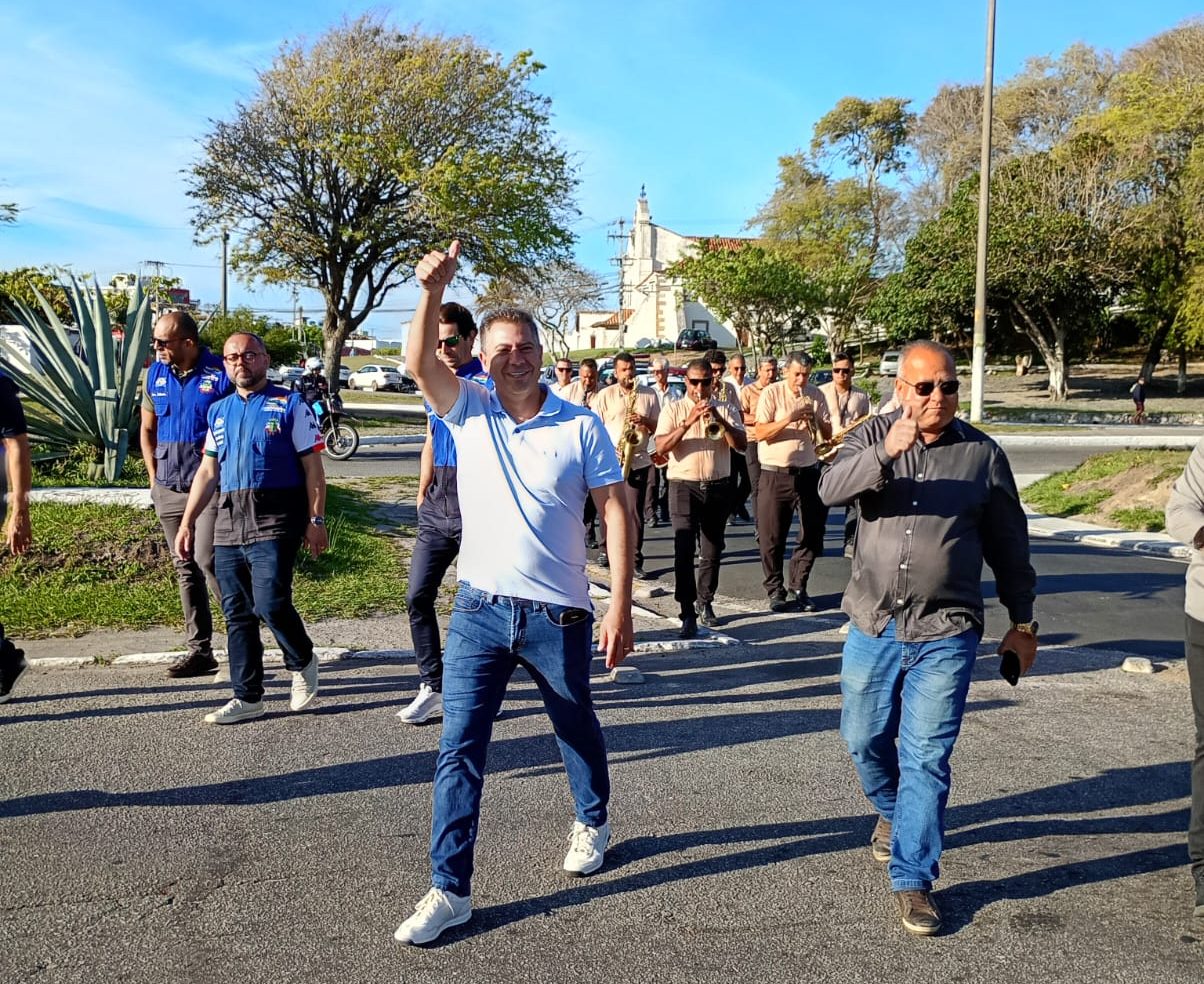 O momento foi precedido por um cortejo com a banda. Serginho e os músicos passaram por pontos simbólicos da cidade, como o Canal do Itajuru, a Praça Porto Rocha, a Rua Treze de Novembro e a Praia do Forte, onde o gestor aproveitou para conversar com a população e apresentar equipamentos públicos adquiridos durante os 11 meses de governo.