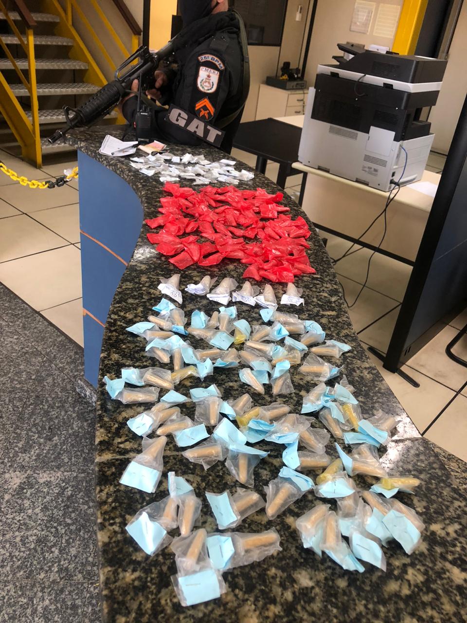 A equipe se aproximou do rapaz e realizou a abordagem, segundo a polícia, o rapaz estava com rádio transmissor na cintura e na sacola foram encontradas 130 cápsulas de cocaína e 39 buchas de maconha, além do rádio transmissor e um caderno de anotações.
