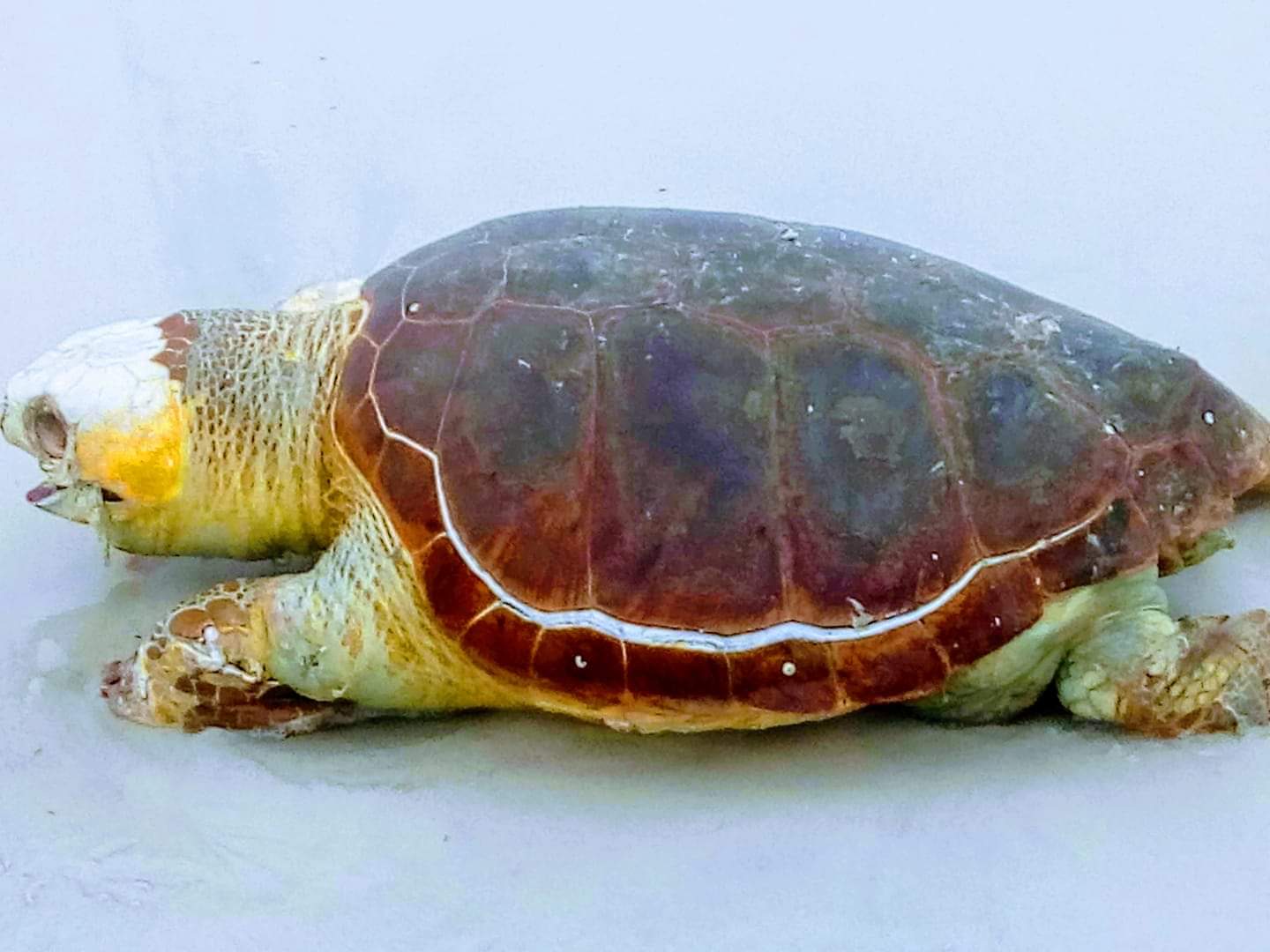 Uma tartaruga-marinha-comum (Caretta caretta) foi encontrada na manhã desta segunda-feira (11) na altura do Hotel Malibu, na Praia do Forte, em Cabo Frio.