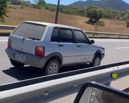 O impacto foi tão forte que o pneu do caminhão estourou e a frente do Uno ficou completamente destruída. O motorista do caminhão não sofreu ferimentos graves.