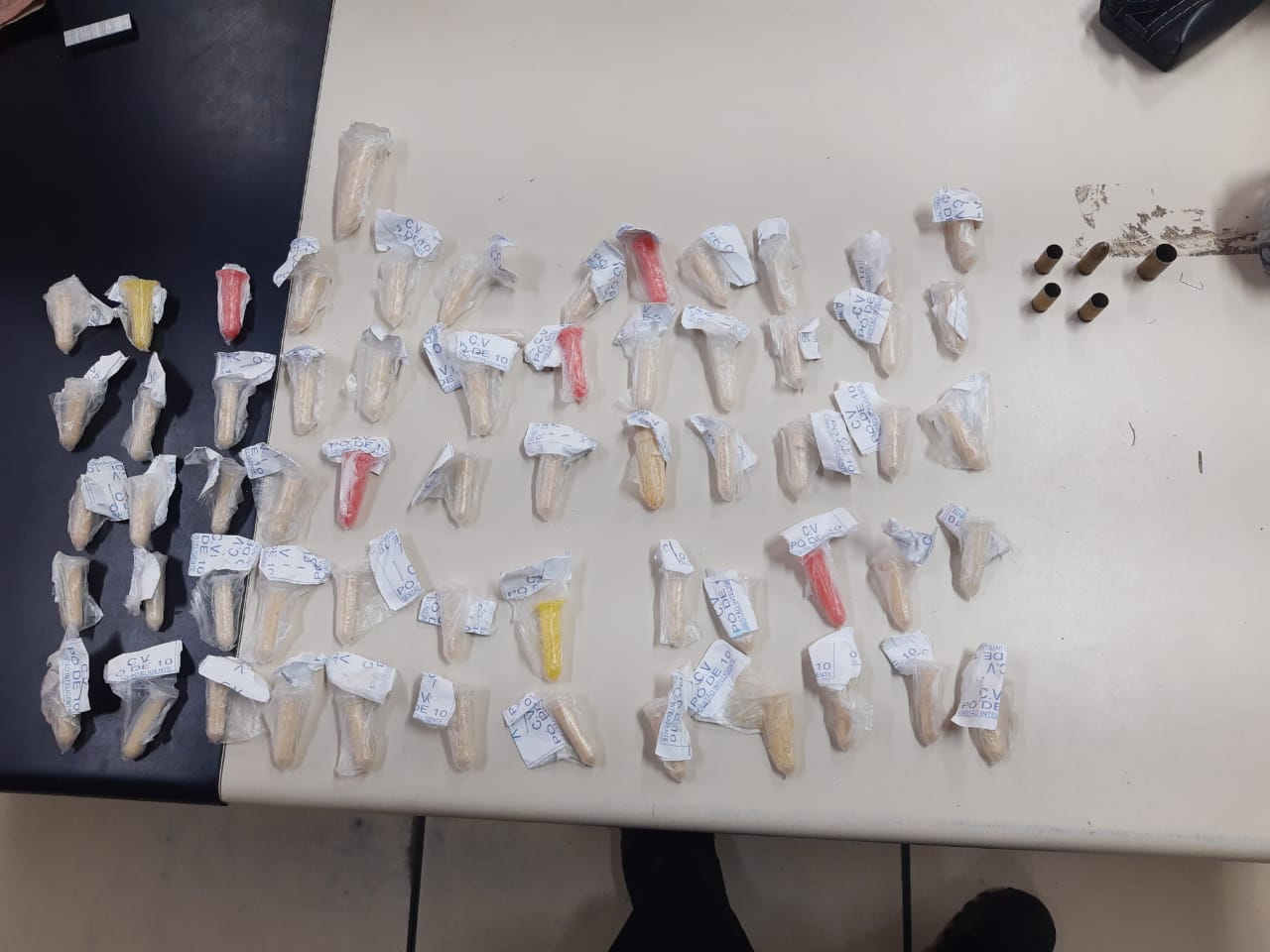 Com eles foi encontrado um saco contendo 61 cápsulas de cocaína, três cápsulas usadas de munição para pistola 9mm; uma munição de 9mm; e uma cápsula de 45mm.